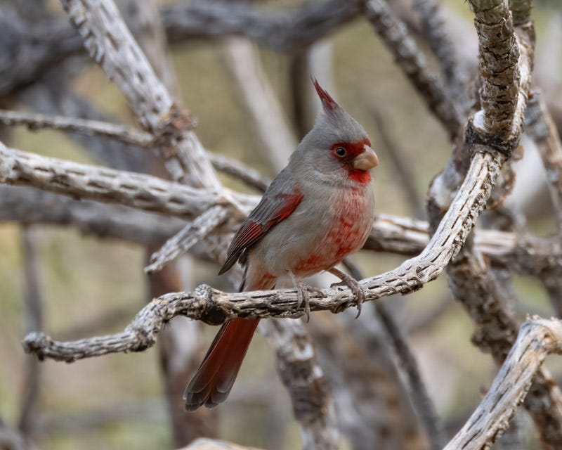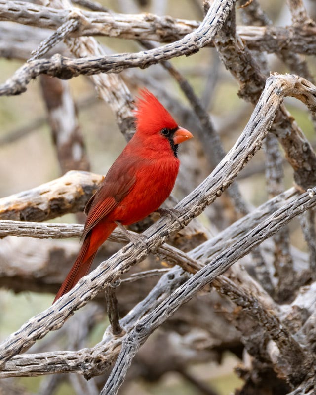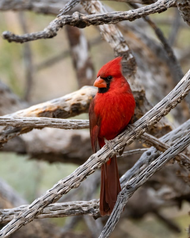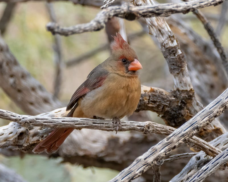 In both of the photos above and below, the Cardinal is on the exact same cholla branch. To learn more about Cardinals, I again refer you to Birdnote: https://www.birdnote.org/podcasts/birdnote-daily/northern-cardinal-meet-cardinal