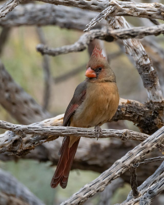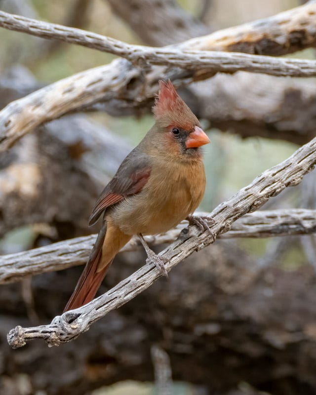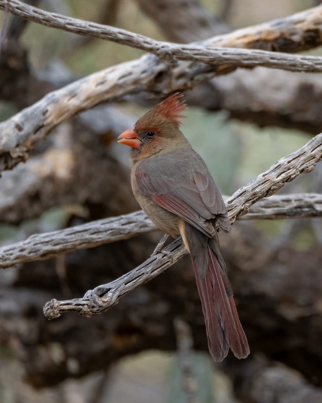 There are plenty of Cardinals in the Tucson area. I find their range map fascinating. While we take Cardinals for granted here, the range map shows them living year round in the eastern half of the United States. In the US west of Texas, Cardinals are only to be found in southern New Mexico and southern Arizona.