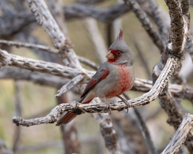 Shaped like a Cardinal, the male Pyrrhuloxia is mostly a grey bird but it has a red mask along with red on its belly and its wings and its crest. It has a longer crest than the Cardinal and a beak that is stubbier than the Cardinal and more parrot-like. The roots of its name come from the Greek word "pyrruos" meaning flame-colored and "loxuos" meaning crooked. The Pyrrhuloxia shares its preference for the cholla skeleton as a launching point into my yard.