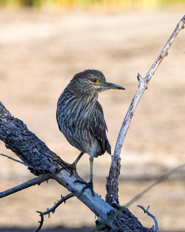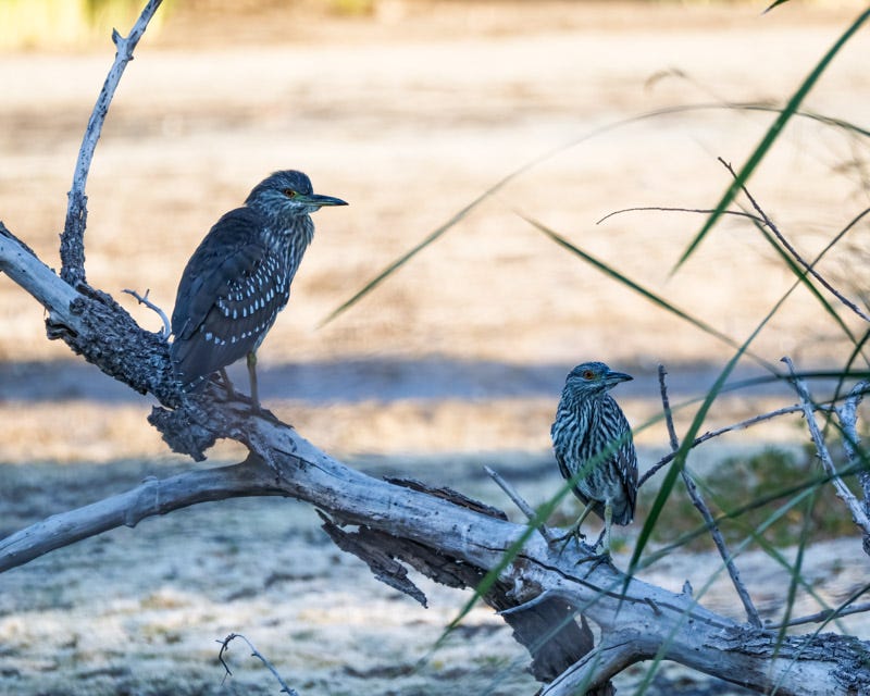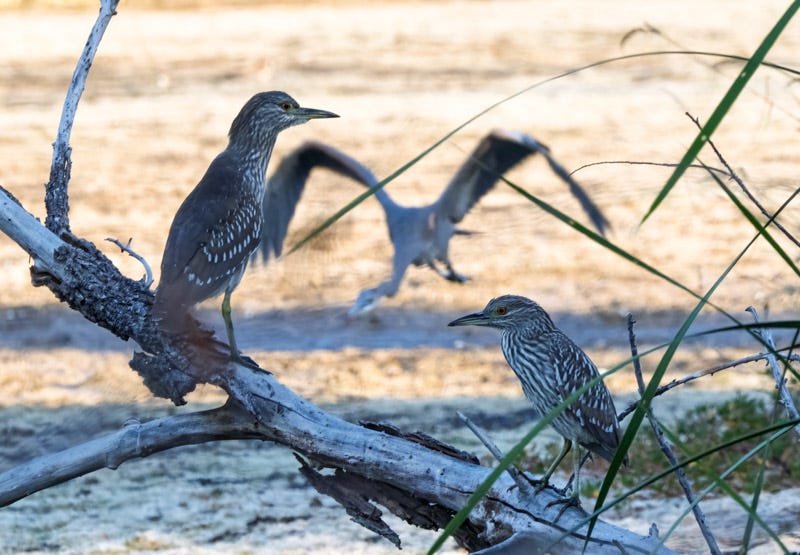 The two juvenile Black-crowns remained on their perch for a long time. Despite being “photo-bombed” by an incoming Great Blue Heron, they remained stoic. During the first hour that we were watching from that spot, a number of Green Herons, Great Blue Herons, and Great Egrets flew around the lake bed, but these two herons just sat still.