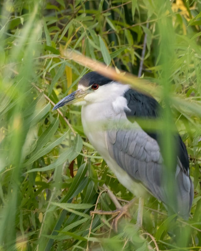 The Night Heron began walking up the branch it was on. In this shot, you can also see that the plumage of its neck gives a blurry look. The spotted feathers on the wings are not blurry at all compared to the feathers on its neck. That’s a feature of the bird, and not a result of how I shot the photo.