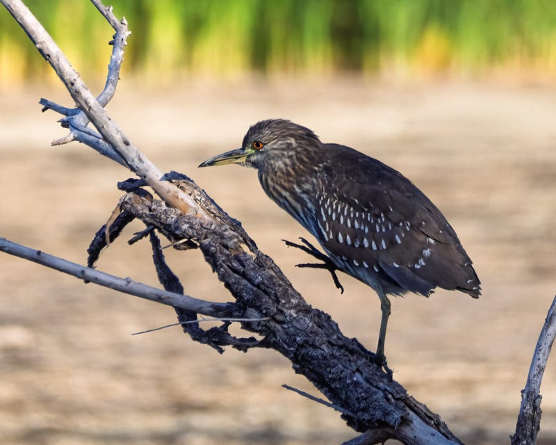 A few days prior to this visit I was with a Tucson Bird Alliance group at Sweetwater Wetlands and we saw an adult Black-crowned Night Heron hiding deep in the reeds. We have Black-crowned Night Herons in the Tucson area year-round in most wetlands and ponds. They do their hunting between dusk and dawn when there is no competition from the other herons and egrets. During the day, they will rest in trees, bushes or in the reeds.