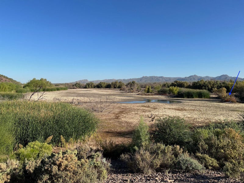 I’ve been frequenting El Rio Preserve in recent weeks. It is always a nice place to visit, whether or not you are a birder. At over 100 acres in size, the preserve’s water and surrounding riparian vegetation offer a calming presence. What has brought me here more often these days is the plans by the City of Marana to drain the lake in order to conduct some needed maintenance. Last week, this was the view of the ‘lake’ from the viewing platform. There are just a few water holes left but there are still plenty of resources for birds and wildlife. Most of today’s photos were taken from what I call “the island” located at the blue arrow in the photo. However, any spot along the shoreline offers great opportunities to observe birds and wildlife. All you need to do is sit and wait!