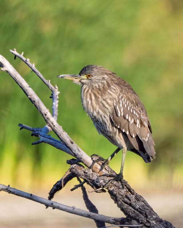 The adult Black-coroned Night Heron has the black crown that it is named for. That black crown contrasts with the birds’ white/gray belly and wings. It takes young Black-crowned Night Herons about three years to obtain that adult plumage. Until then, the young Herons are brown and streaky. There were two of these juveniles near the ‘island’ early one morning at El Rio. They were in the deep shade.