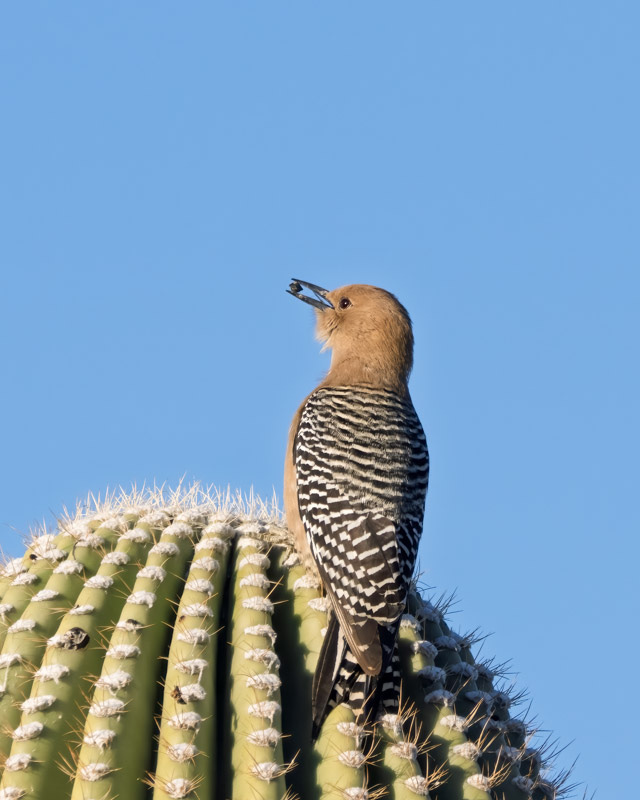 Meanwhile, a nearby female Gila Woodpecker had found a prize of some sort. She held this bean or berry proudly without singing. After a while she flew off with her treat.