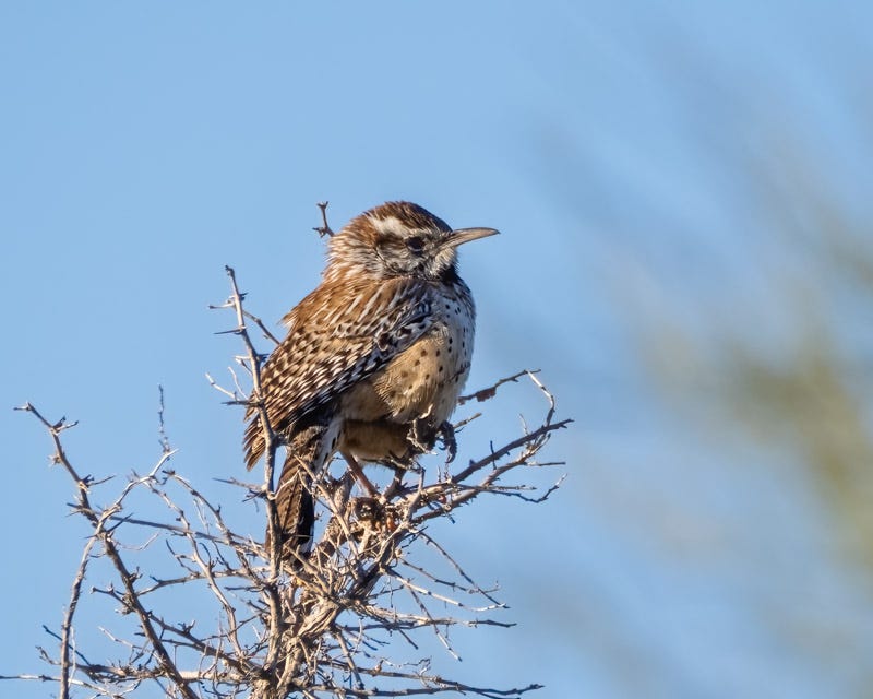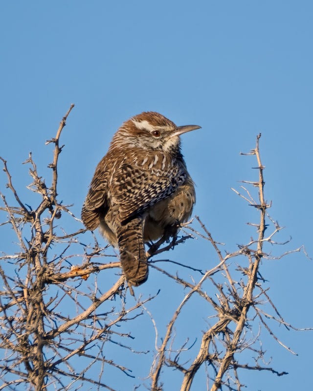 Another view of this Cactus Wren shows how cold it was, trying to stay warm on this wintery morning. A slim species, this Cactus Wren looks positively puffy. Almost all Wrens feature barred (striped) tails and a slender bill. Cactus Wrens are the largest Wren species in the United States.