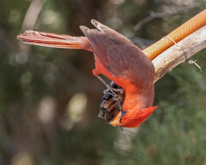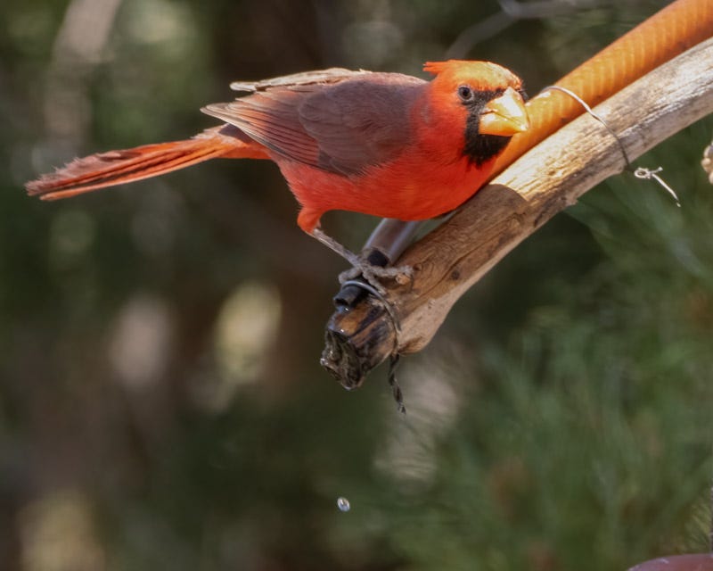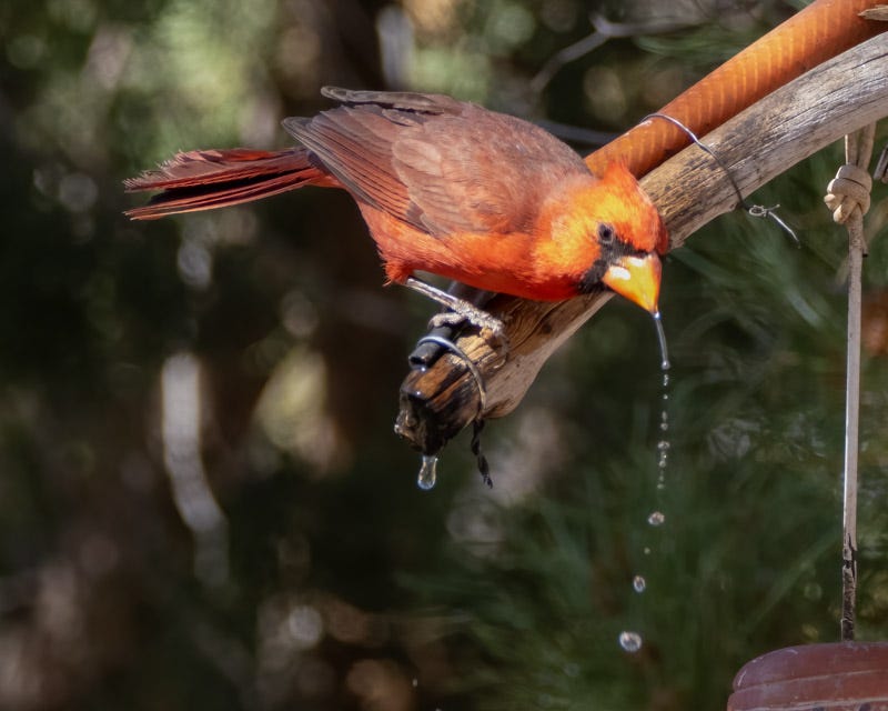The lighting at that spot wasn't the best for photography, but I wanted to capture the birds' behavior. As this Cardinal comes in for a drink, its head is in bright sunlight and its body is in the shade.