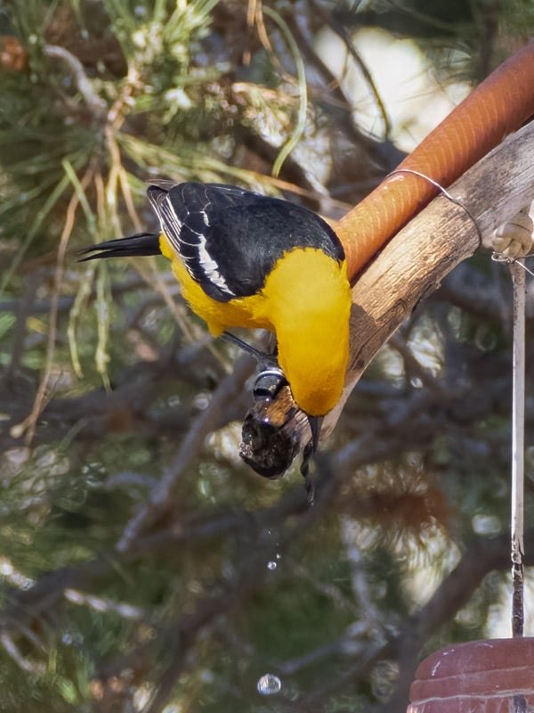 Again, most, but not all, birds drink with the help of gravity. Birdnote shares some of the exceptions. A very handsome Hooded Oriole stopped by to drink.