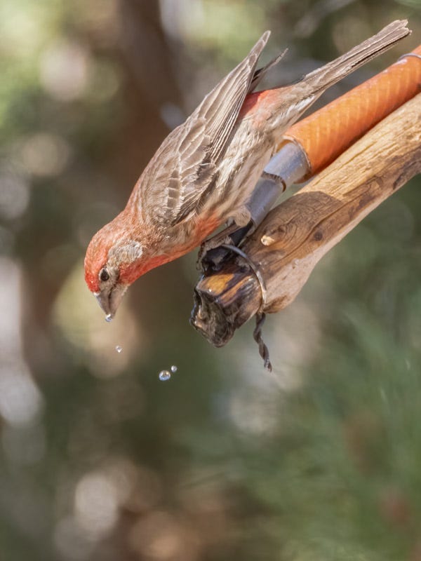 Several homes in or near Portal in the Chiricahuas have set up their backyards for birdwatching. They have many, many seed feeders, suet cakes, hummingbird feeders, water sources and other supports to encourage nearby birds to stop by. At one of these lush backyards there were two water features on the ground for birds to drink from and bathe in, but there was also a slow drip feature. Quite a few birds chose to drink at that 'drip' rather than at the other birdbaths. It was interesting to watch how the birds used that drip fountain. Here, an Acorn Woodpecker gets set to drink.