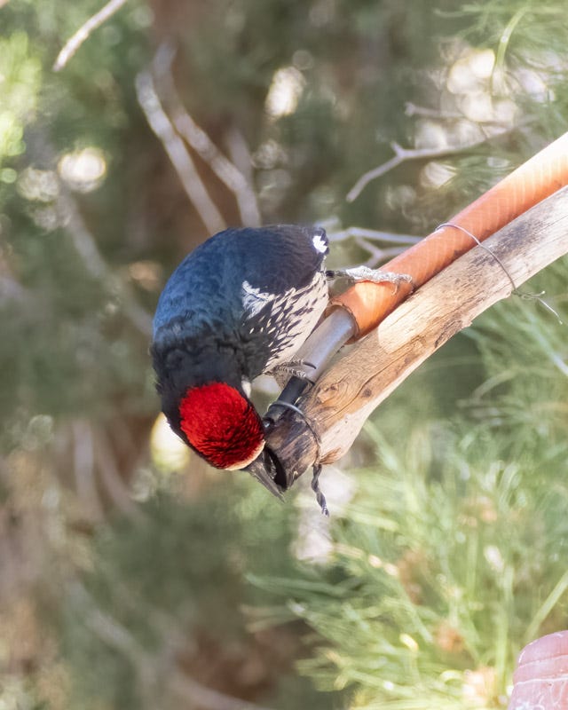 And down it goes for a drop or two of water. This is a male Acorn Woodpecker. Both the male and female Acorns have red on their heads but the female has a patch of black between the red crown and the white forehead.
