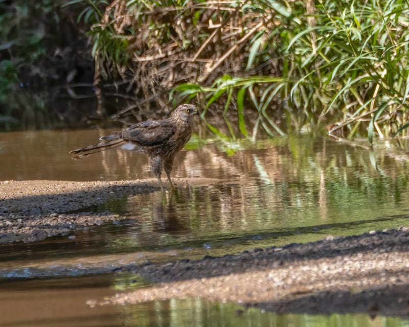 As of early-July, most of the water sources in southern Arizona had dried up this year. It has been a brutally hot year for us. A friend and I visited one stretch of the Santa Cruz River south of Green Valley to see how things looked. In this riparian corridor, we could affirm the truism that "In the desert, where there is water there is life". Shortly after we settled down in our chairs, a Cooper's Hawk dropped by to drink. This bird likely hatched last year and, with a mix of gray and brown feathers, is considered a subadult. Perhaps next summer it will display the gray plumage of a full Cooper's adult.