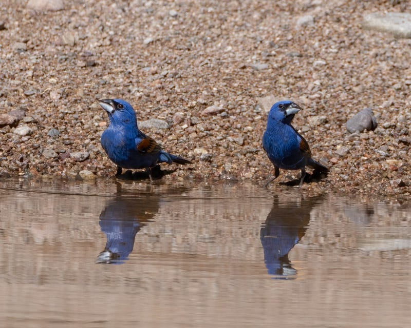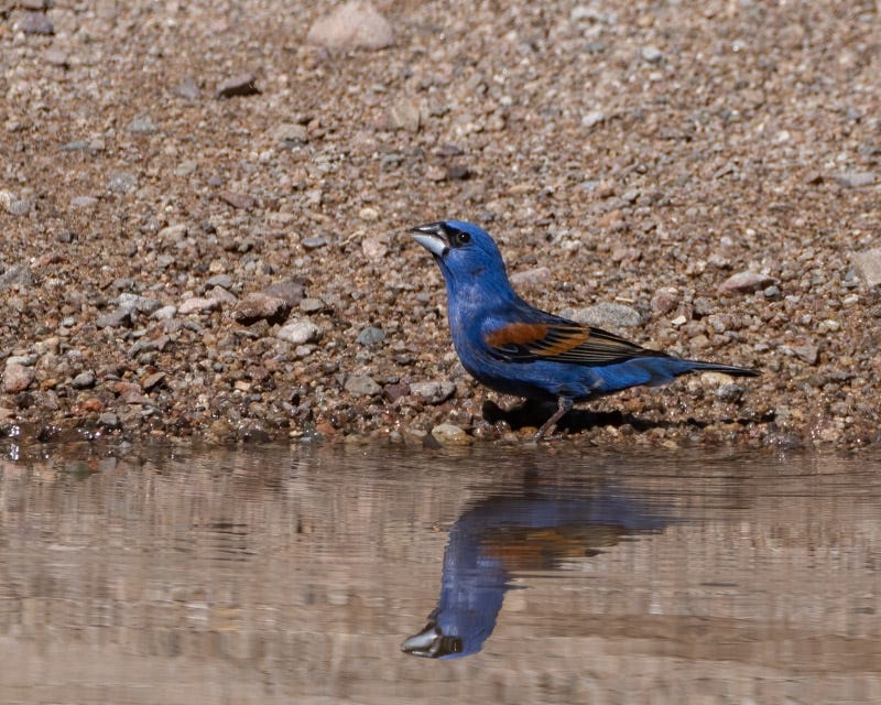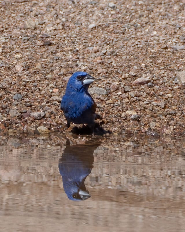 One of the really special species that arrives in southern Arizona every summer is the Blue Grosbeaks. With their bright blue feathers, silvery bill, and chestnut wingbars, they are eye candy for birders. Quite a few of them came to the water where it crossed the road.