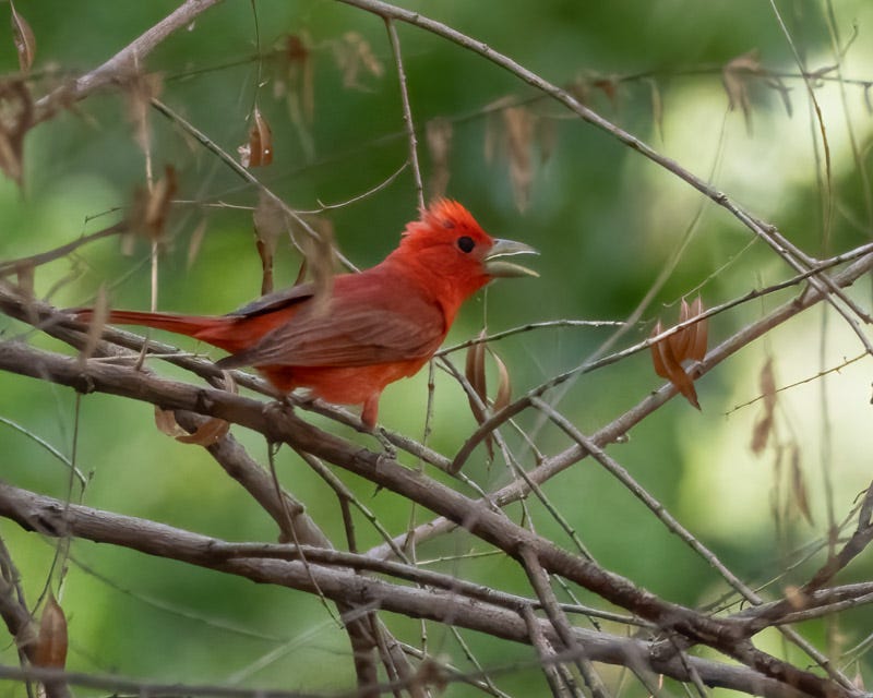 A pair of Summer Tanagers came through. Summer Tanagers are a summering species seen in much of the United States. However, during the winter, this species lives from central Mexico down through South America. The male is the only completely red bird in America. Male Cardinals are mostly red but do have a black mask.