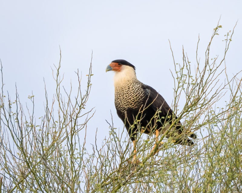 This Crested Caracara was atop a palo verde tree near a housing development. These Caracaras are also falcons, but evolved very differently some 7-11 million years ago. They are not speedsters like other true falcons are but are a fascinating and unusual looking bird-of-prey. Matt Griffiths wrote a nice piece for Tucson Bird Alliance about these members of the falcon family.