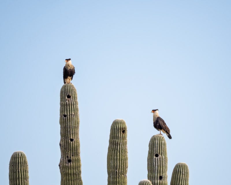 Later on our drive, we saw two Crested Caracaras on a giant Saguaro cactus. In southern Arizona, Crested Caracaras build their nests in the swirling arms of Saguaro cacti. For those Crested Caracaras who make their home further south into Mexico where there are no Saguaro cacti, they will use other columnar cacti such as Cardon or Organ Pipe to place their nests in. The Desert Museum shares some information about Crested Caracaras and other falcons.
