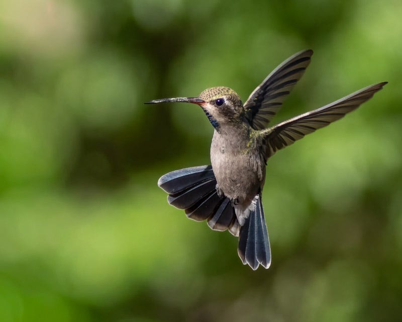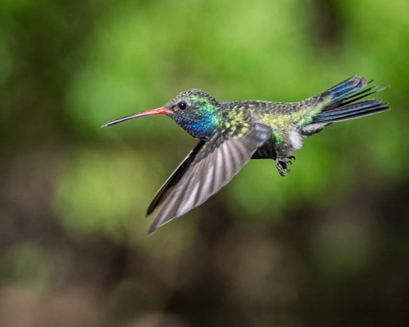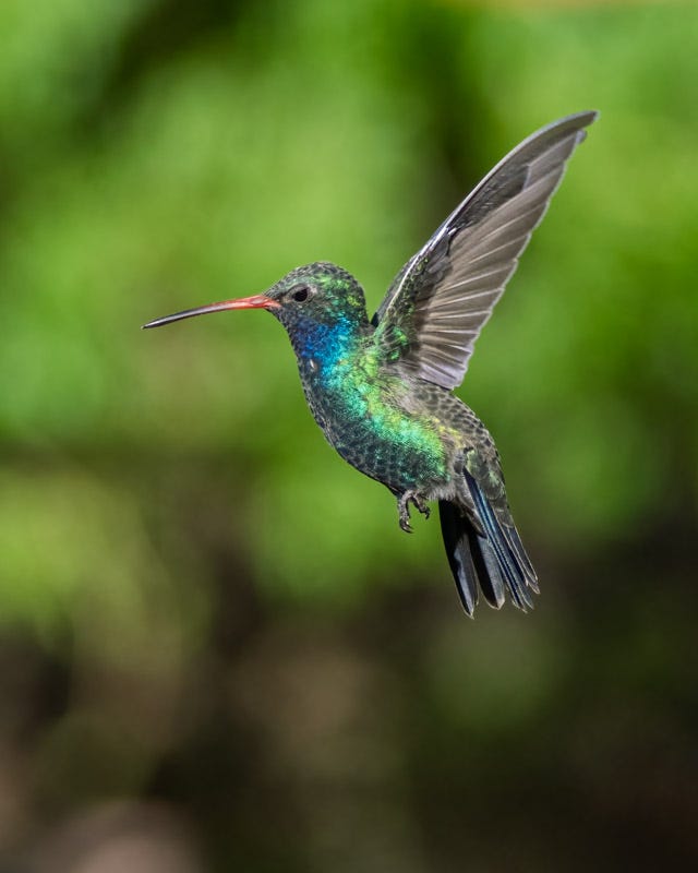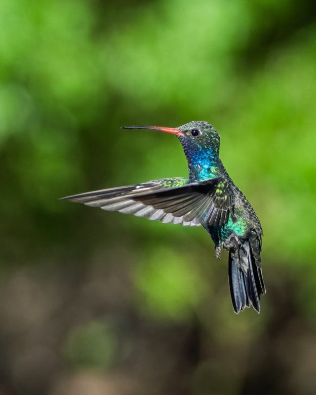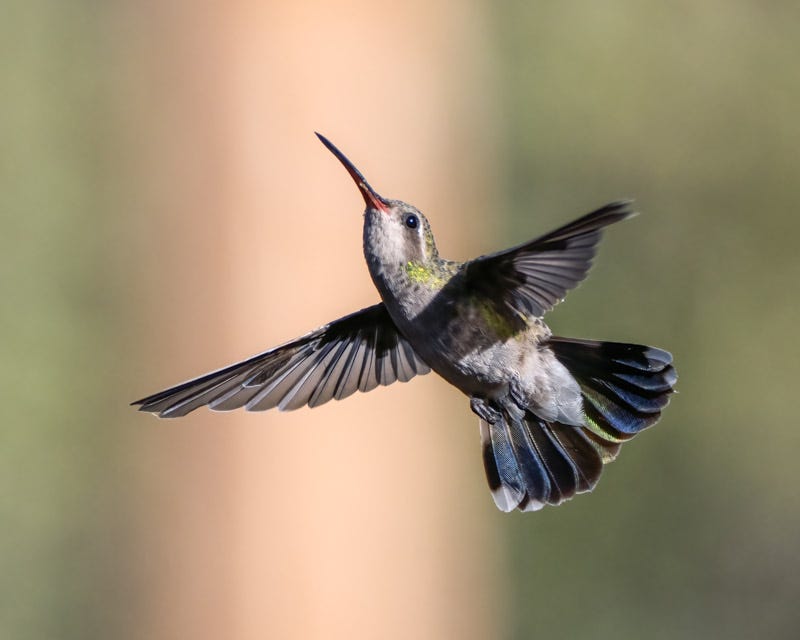 Hummingbirds' flight skills are astounding. Their wings beat in a figure eight pattern and can turn 180° which allows them to create lift on both the forward or downward and the backward or upward strokes of their wings. I read one estimate of a Broad-billed Hummingbird's wing strokes to be as fast as 70-75 wingbeats per second!!