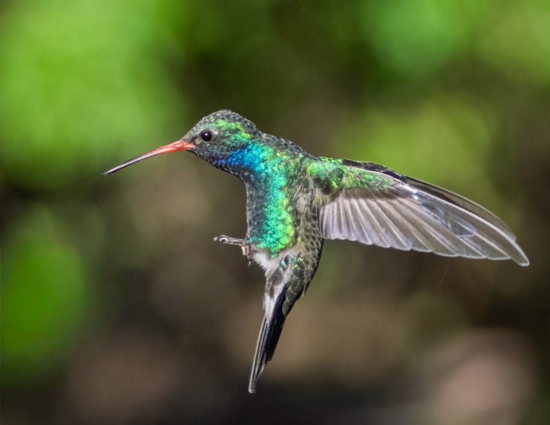 Male Broad-bills have a blue throat and a blueish/green belly and have an orange/red bill tipped in black. Broad-bills also have a notched tail, slightly visible below. These hummingbirds are small, about the size of a small finger. They weigh only 0.1 of an ounce, about 3-4 grams, and they consume almost double their body's weight in nectar daily.