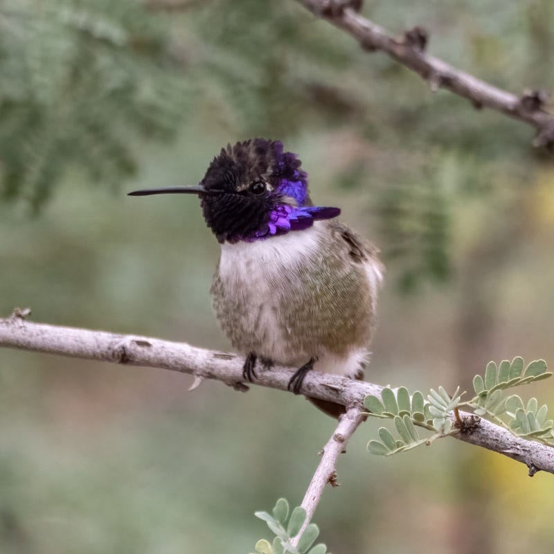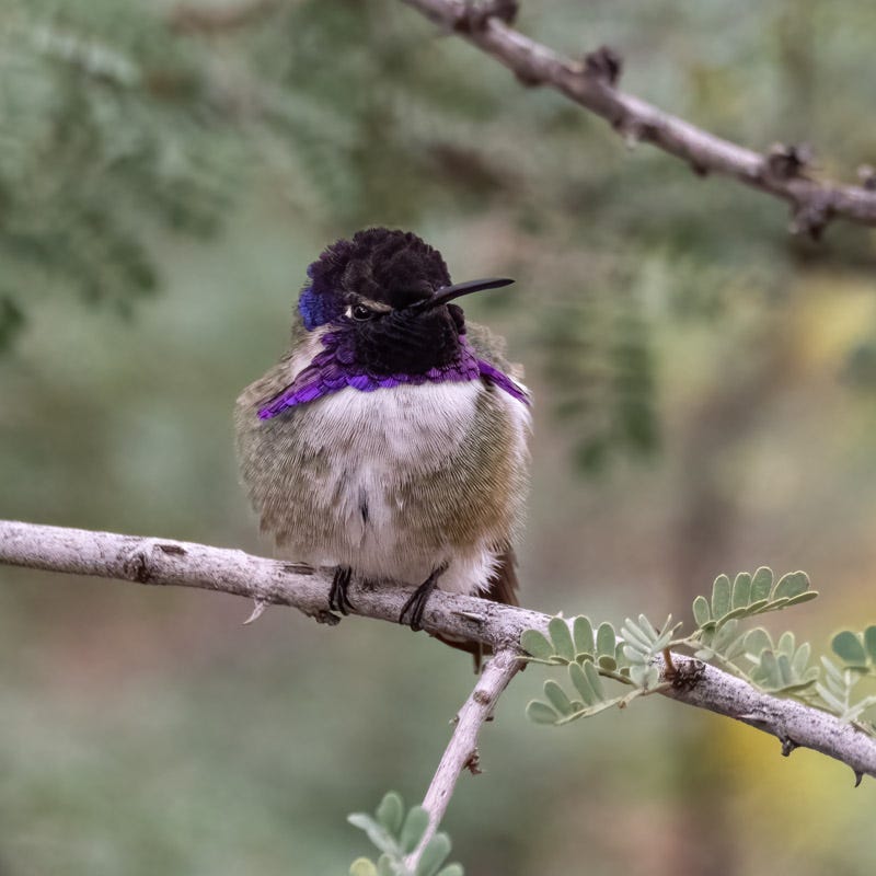 When the Costa’s Hummingbird finished and sat up straight, some of its gorget feathers lit up!