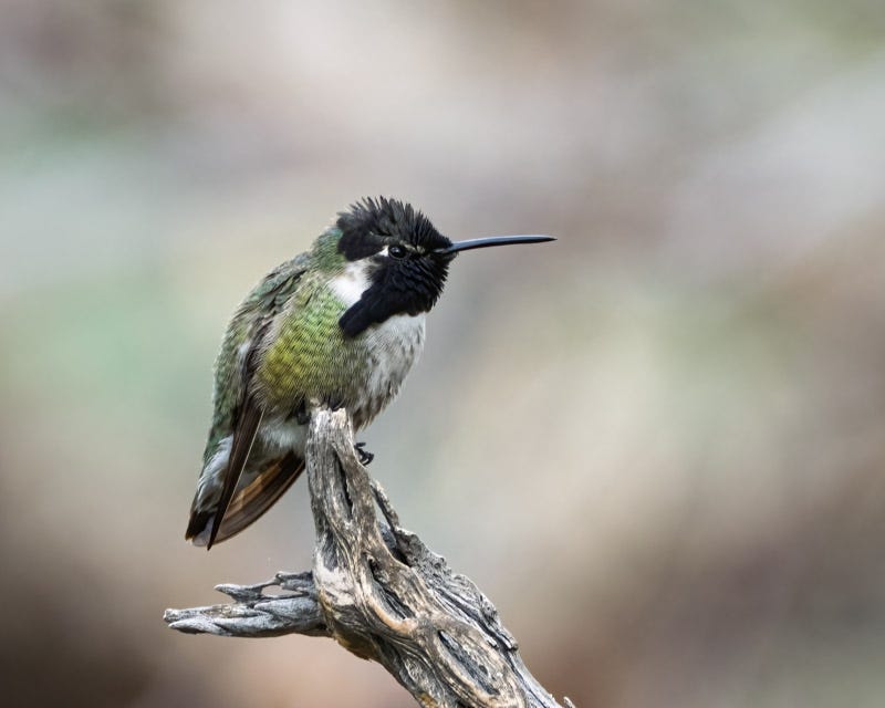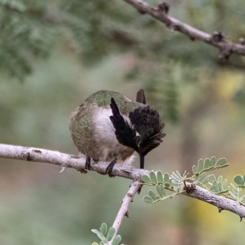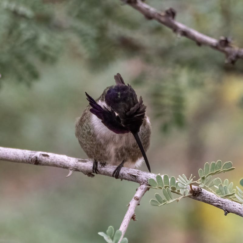 Costa’s Hummingbirds have several favored perch spots within their territories. On this twig, the Costa’s proceeded to “feak” with its bill. This common bird behavior helps to act like a napkin to clean off their bill. In the Hummingbird’s case, pollen and nectar is cleaned from the bill. Bird beaks are made out of keratin, the same substance our nails and hair is made of. When birds “feak” it helps to smooth and shape their bill.