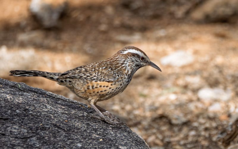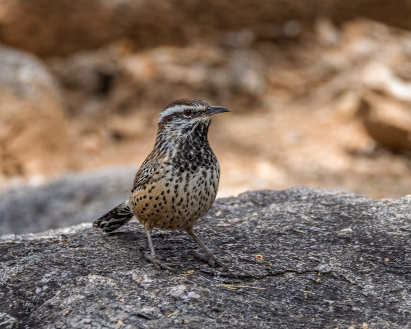 Another very common bird in our desert is the Cactus Wren, Arizona’s State Bird. They are large wrens and are not shy. Cactus Wrens always seem to be on the move, investigating their surroundings and looking for food. The sounds of a Cactus Wren are heard in virtually every documentary about our desert. If you listen to their sounds at AllAboutBirds, you should recognize it.