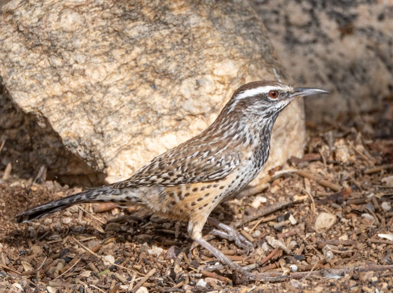 In my yard, the Cactus Wrens explore every nook and cranny, checking under the edges of all rocks and along the ground for things to eat. Cactus Wrens mostly eat insects although they will also eat cactus fruit. They get the majority of the water they need through the food they eat and do not need to drink from free-standing water.