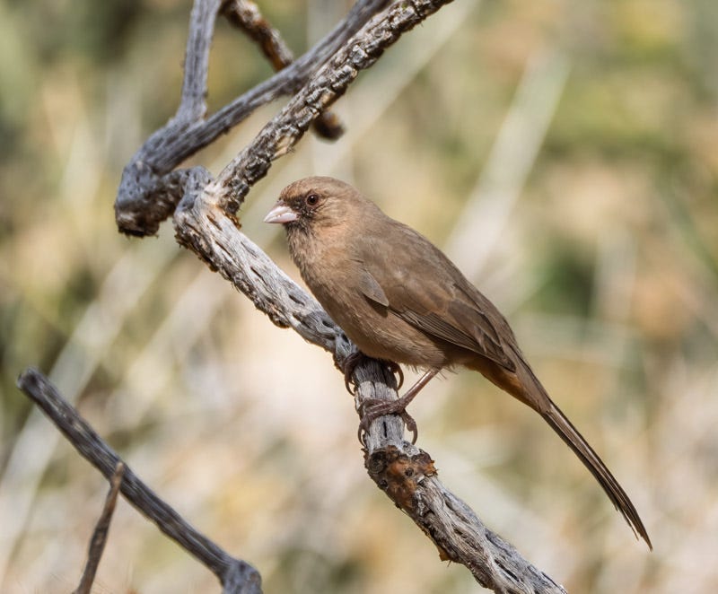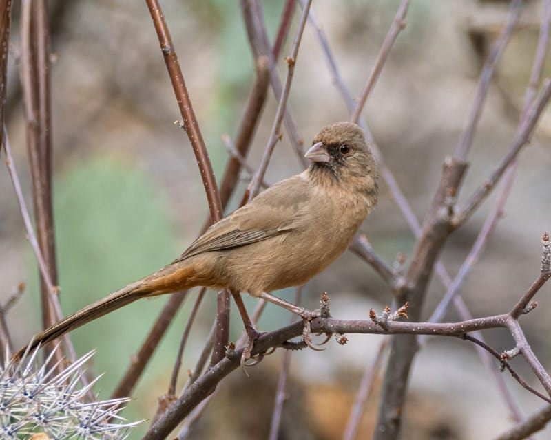 Abert’s Towhees are a common sight in the Sonoran Desert. Males and females look alike. Abert’s Towhees are found in brushy areas and their color matches the sandy brown of their desert environment. Abert’s Towhees have a small black patch on their face. (And the name is Abert’s, not Albert’s)