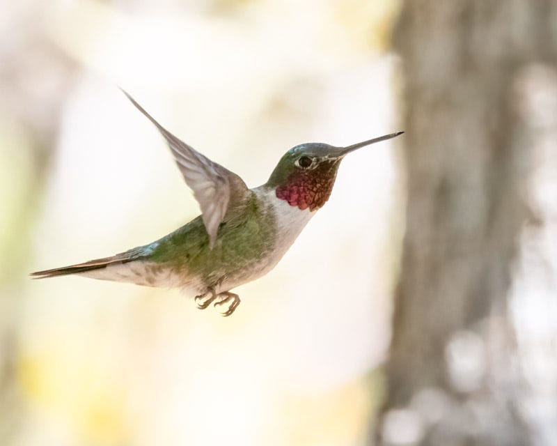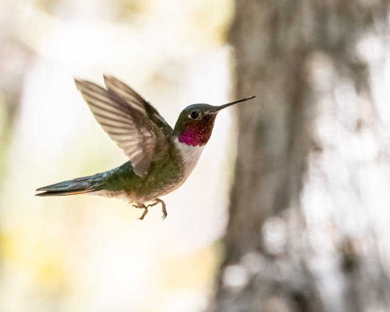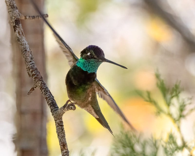 Rivoli's Hummingbirds were frequenting the feeders. Their bright feathers rarely showed in that morning's light but at one point the male's green throat glowed as it was ready to take-off.