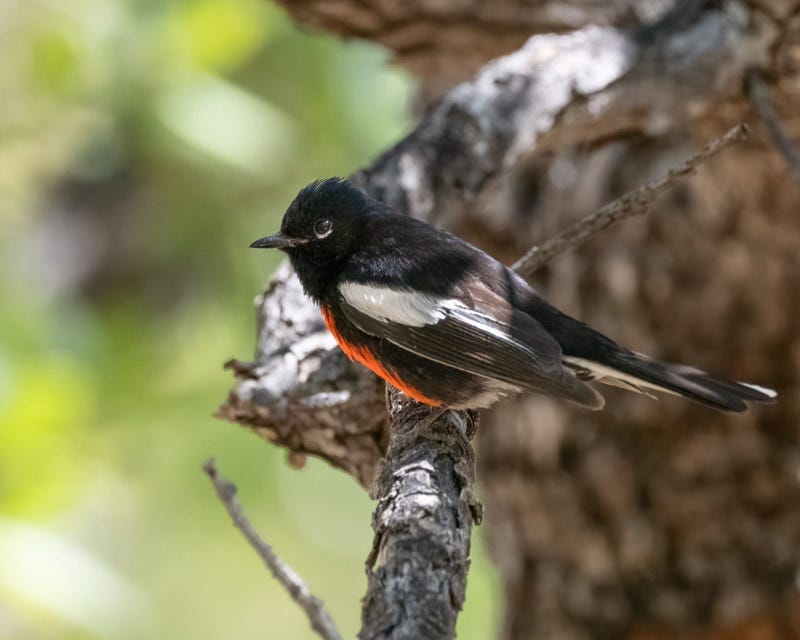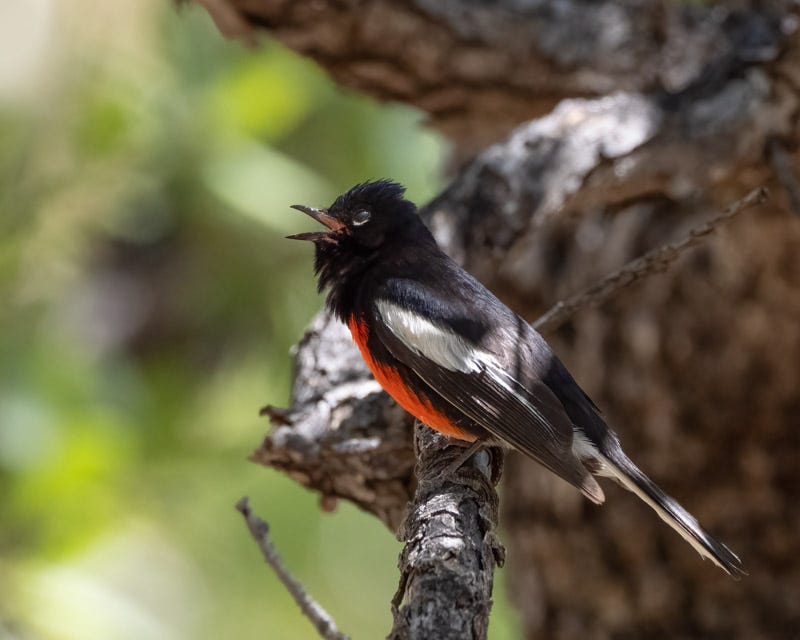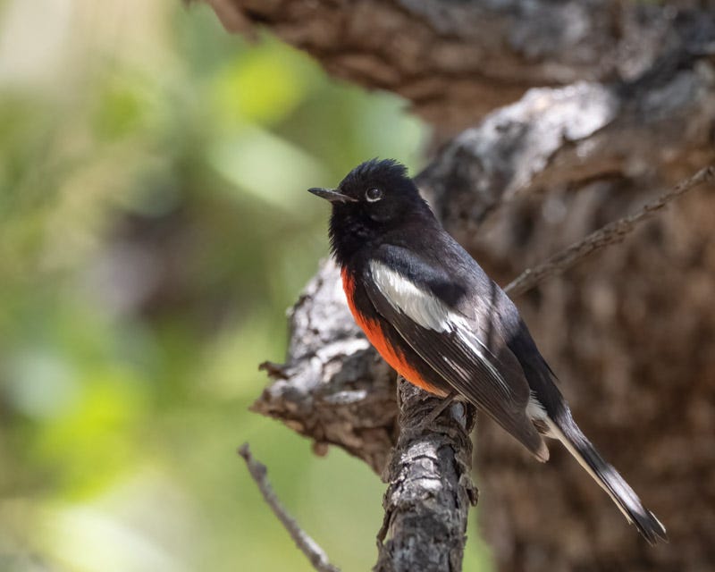 The Painted Redstart is found in oak-pine-juniper canyons of the Southwest.
