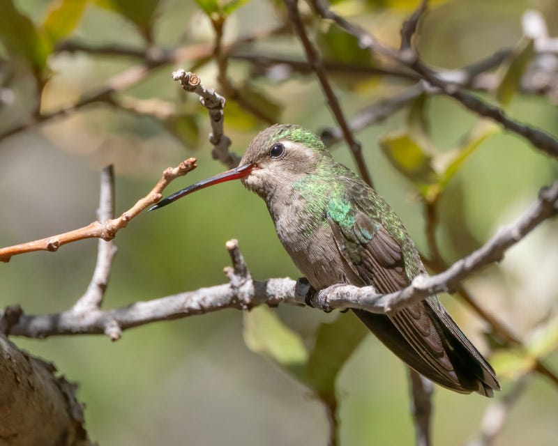 There were many hummingbirds coming to the feeders. We visited this site late in the morning so the lighting for photographs wasn't the best. In addition, the birds had many perch spots in the shadows and behind branches. There were a few times one would perch in the open as this female Broad-billed Hummingbird did. You can see the orange on the underside of her bill.