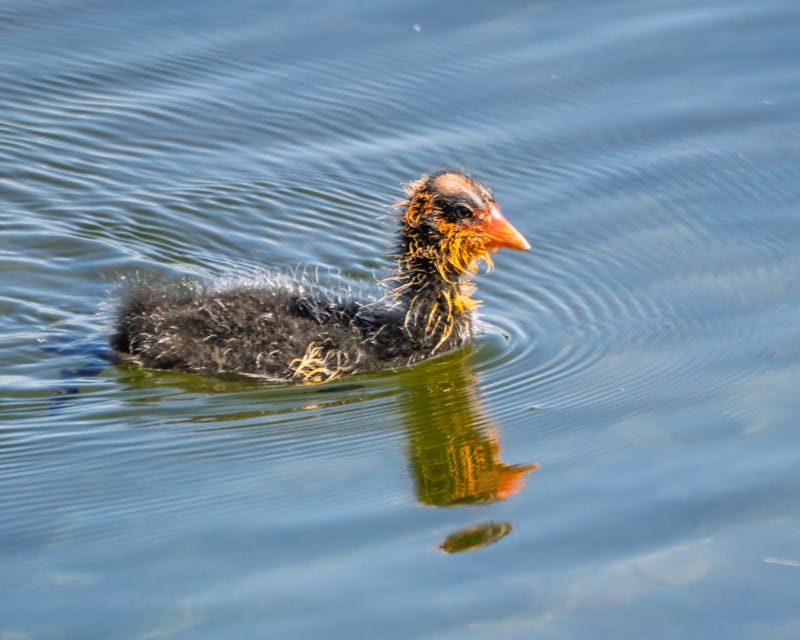 Young American Coots also have a very distinctive, but different, look from the young Pied-billed Grebes. The bald head and the curly, stiff hairlike feathers on the head and chin give an almost comical appearance to the young coots. Those orange feathers will drop off around two weeks of age.