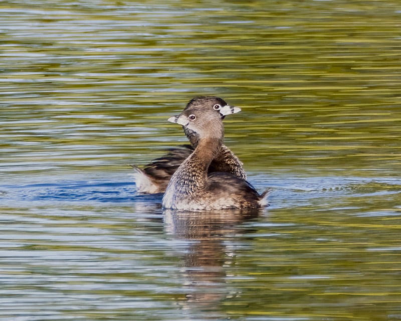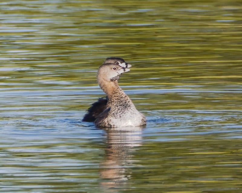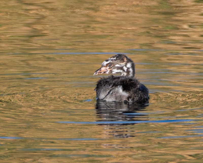 At another body of water in the Tucson area, a young Pied-billed Grebe was swimming around. About two weeks after hatching, young Pied-billed Grebes develop striped feathering on their heads. I call it the “zebra-head” stage of development and is an unusual look. This bird is young enough to still show some fuzzy down on its body. It was looking back over its shoulder at me.