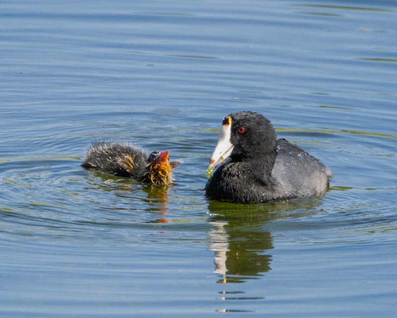 This young Coot was begging to be fed. If you look closely, you can see two very teeny wings spread out from the Coot’s body. There were two different sets of parents and young at this pond. The American Coot below was offering vegetation exclusively to its chick. The other parent would step on the shore and grab one of many beetles from the grass and return to the water to offer the bug to its young.