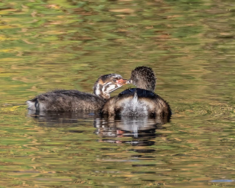 The young Grebe can swim well now but still depends on its parents to feed it. Both parents share in feeding their young. Pied-billed Grebes are opportunistic and will feed on all sorts of aquatic life as well as vegetation.