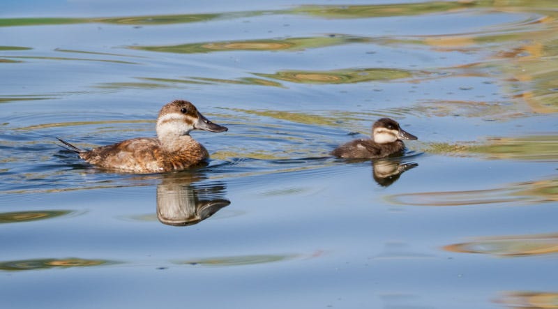 Even with those skills, the young Ruddy Ducks continue to swim close to their parent. The adult female duck is the sole caregiver at this point and the ducklings remain near her for a few weeks more for protection than for care. By about three weeks, the adult Ruddy Duck usually will abandon her ducklings and they are on their own.
