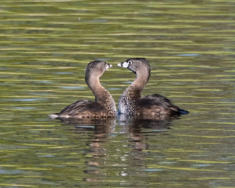 On another pond, two adult Pied-billed Grebes did not seem to have any young, or any dependent young. This couple seemed to be working on their relationship. Grebes can have a second clutch of young but I don’t know whether it is too late in the season for that.