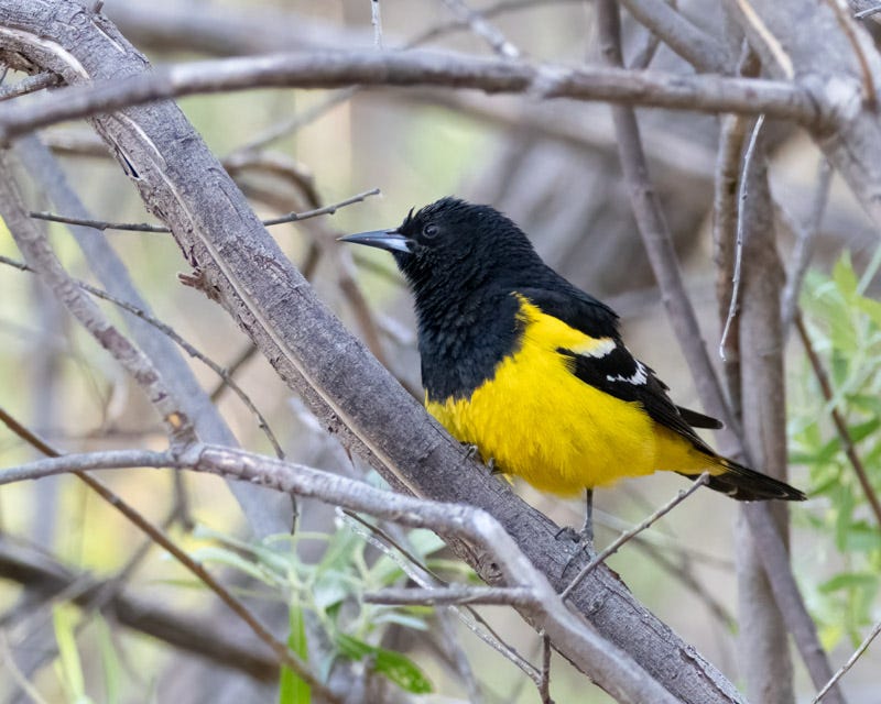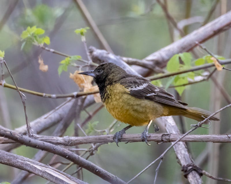 Below is a young male Scott's Oriole. Its dark head lets us know it is not a female. These Orioles take two years to reach adult plumage. The thought is that by not having the full adult plumage at year 'one', the birds are not a threat to adult males and the adults will not harass the younger birds or try to chase them out of their territory.