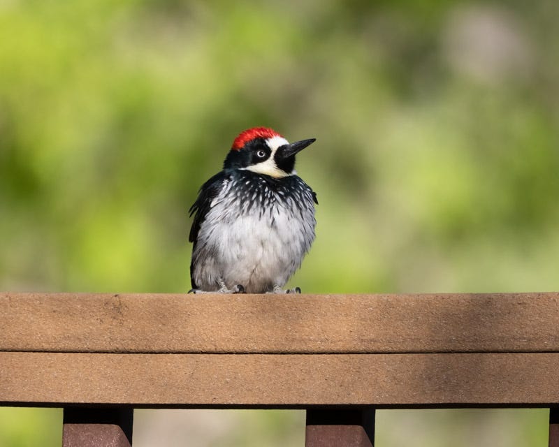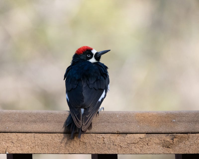 In many woodpeckers in the US, it is the males of the species that has red on its head. For Acorn Woodpeckers, both the males and females have red on their heads. The red on the males touches the white forehead. Female Acorn Woodpeckers have black feathers between the red and the white on their heads. The Acorn Woodpecker in these photos is clearly a male.