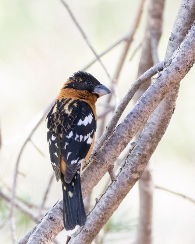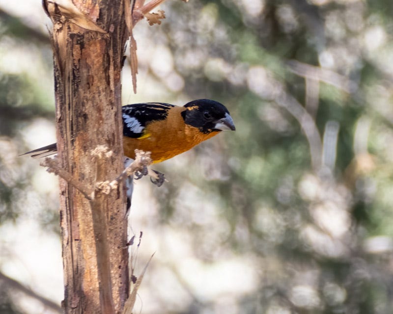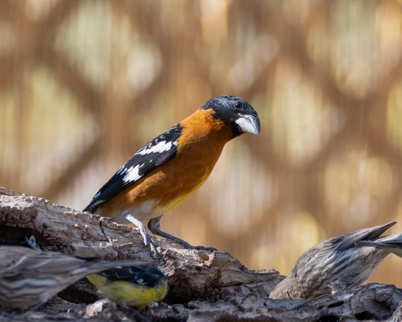 This Black-headed Grosbeak below looks like he's about to topple over. He was eager for a turn at the feeder and waited for a few other birds to finish before hopping in.