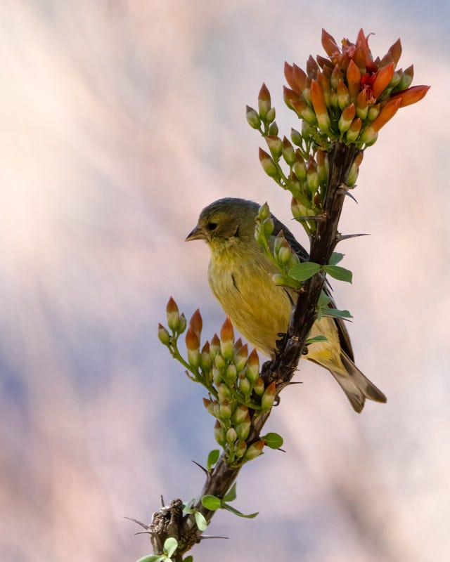 A Lesser Goldfinch stopped on an ocotillo stalk where flowers were just about ready to bloom.
