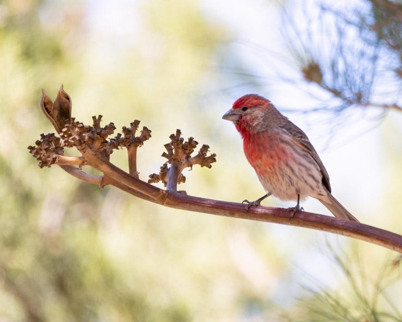 Here is an assortment of birds seen on my trip to the Chiricahuas. A male House Finch came into a yard for seeds but stopped on a dry agave stalk first.