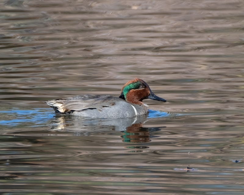 Green-winged Teals are small ducks. The male has a 'cinnamon' colored head with a shiny green streak running from the eye to the back of its head. The male Green-winged also has a white stripe on its side. Male and female Green-winged Teals have green patches on their wings that are visible in flight but not usually when they are on the water.