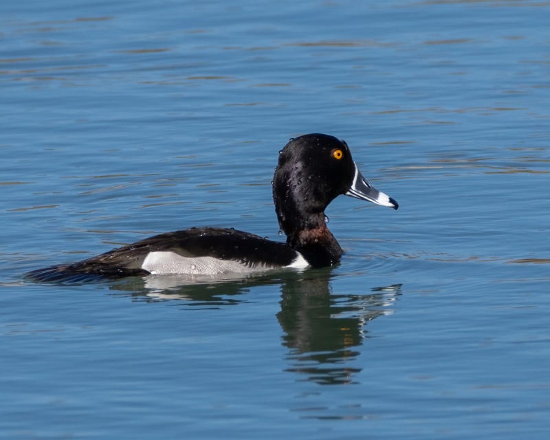 People often call Ring-necked Ducks "Ring-billed Ducks" because of the very noticeable ring around their bills. The ring around its neck is rarely visible. Although this male Ring-necked is swimming away from me, its head is lifted up to show the usually hidden, coppery ring around its neck!!