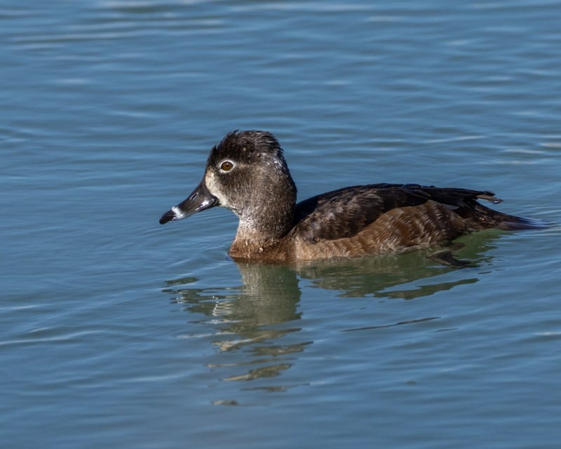 As is common in many species of ducks, the plumage of the female Ring-billed Duck is more muted than that of the males. She is brown-bodied with a gray head. She has a white eye-ring and a white ring around her bill.