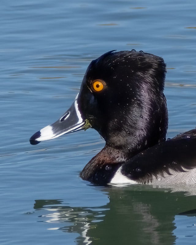 This close-up tells us three things about the Ring-necked duck. First, you can see the chestnut colored ring around its neck. Second, these are diving ducks and feed on both aquatic invertebrates and submerged plant material. You can see some green plants stuck to the back of its bill. Third, just before this duck dives under water, it lays the feathers on its head back, giving it a flat headed look. This bird is just about to dive!