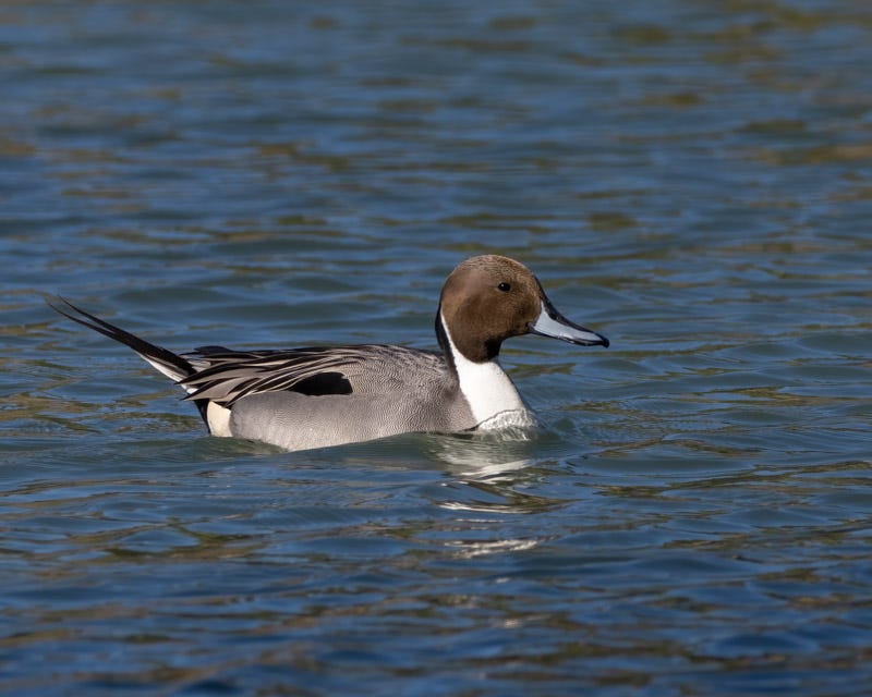 Here is another sampling of the ducks that are wintering in Tucson now. There are a number of ponds and lakes at various local city and county parks, golf courses, and neighborhoods to host these birds. Soon, especially as warm as our winter has been, these birds will be migrating back north to their breeding grounds. The Northern Pintail may be one of the most elegant and handsome ducks around. The long tail feathers give this species its name. You can't always tell how fast a duck is paddling but this one is going fast enough to cause the water to rise on its chest.
