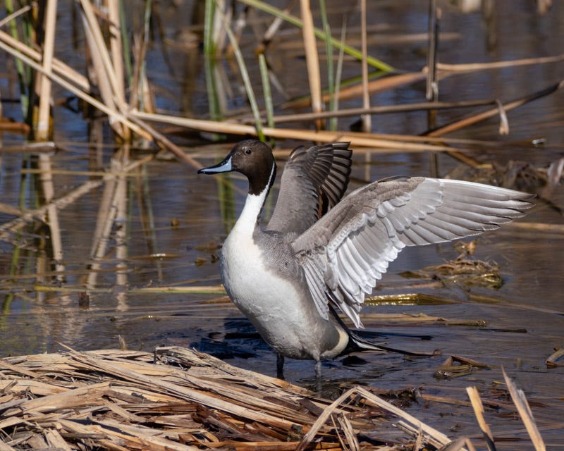 The long neck and thin white pinstripe on its chocolate colored head is a smart look. This Pintail had finished preening and did a final stretch and flap of its wings before settling down.