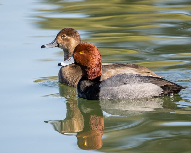 Male Redheads have a red head, of course, set against a black breast and what the allaboutbirds website refers to as a "business gray" body. An interesting fact about Redheads is that the females will lay some of their eggs in other ducks' nests. This strategy is called "brood parasitism" and allows for other birds to incubate the Redhead eggs.