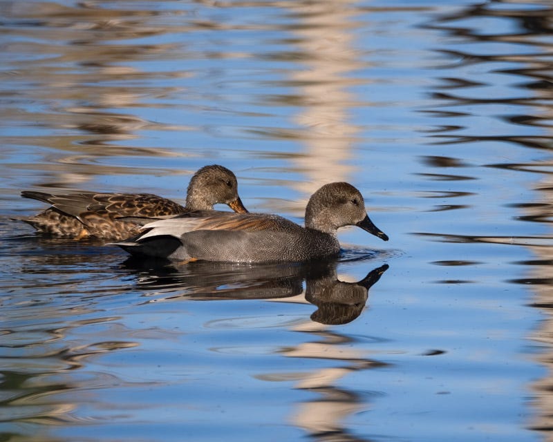 Gadwall ducks are very understated with their looks. The male is gray/brown with a distinctive black rump patch.
