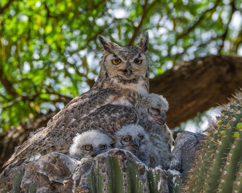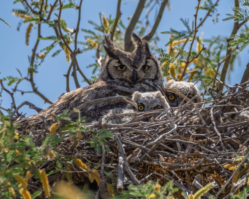 We are in the middle of nesting season for Great Horned Owls in southern Arizona. The families are in varying stages of the season and Great Horned Owls, which don’t make their own nests, are known to inhabit a variety of nesting locations. Great Horned Owls take well to man-made nests.