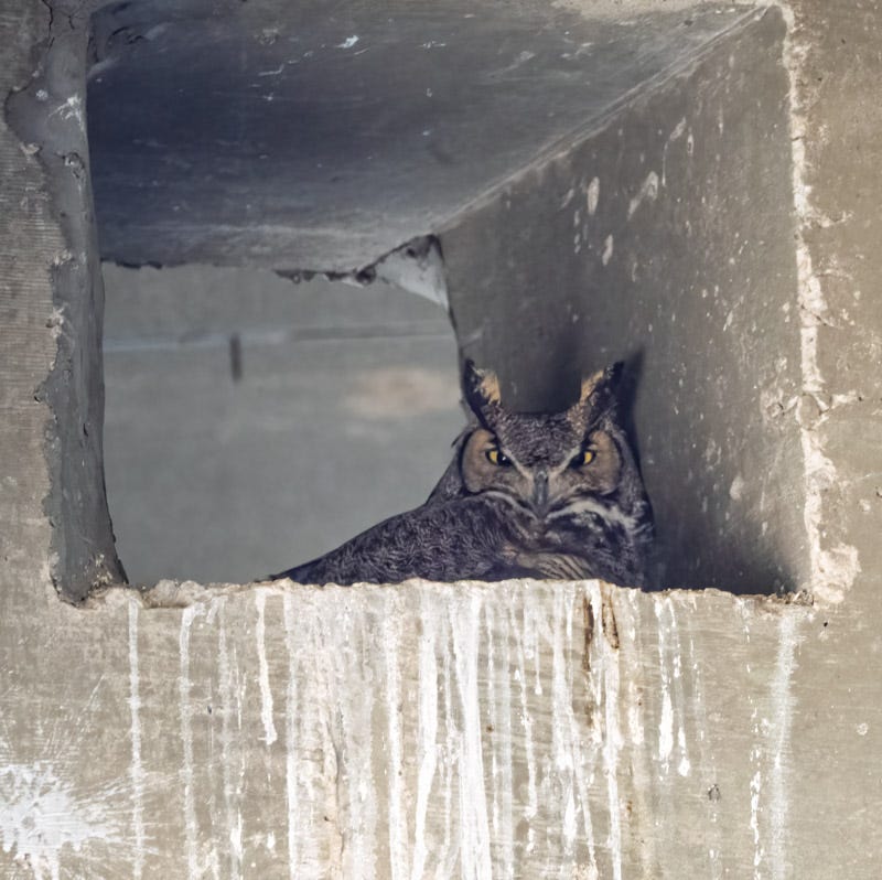 Besides using the nests that other birds built or using man-made nests, Great Horned Owls may also use just about any flat surface that is in a hospitable area. The Owl in the photo below is using an opening in the concrete under a bridge in Pima County. That whitewash on the cement tells us this isn’t the first time Owls have utilized this space for either a roost or a nest.
